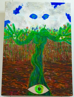 The 1st 2 arrived one after the other as a pair . This 1st one ' The song of connection ' started off very different , and was a real surprise in its final form, letting me know clearly when it wasn't right yet .. and then when it was finally finished , as paintings often do . The eyes in the hands are a reminder of Chenrezig , also known as Avalokiteshvara , the all-seeing buddhist god of compassion, who has 11 heads and 1,000 hands with 1.000 eyes , and therewith enough compassion for the whole world ..